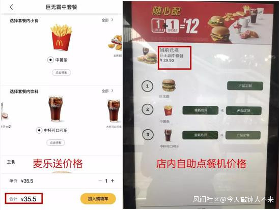 而在阜成路的麥當勞店自助點餐機上,同樣的套餐,卻只要29.5元。