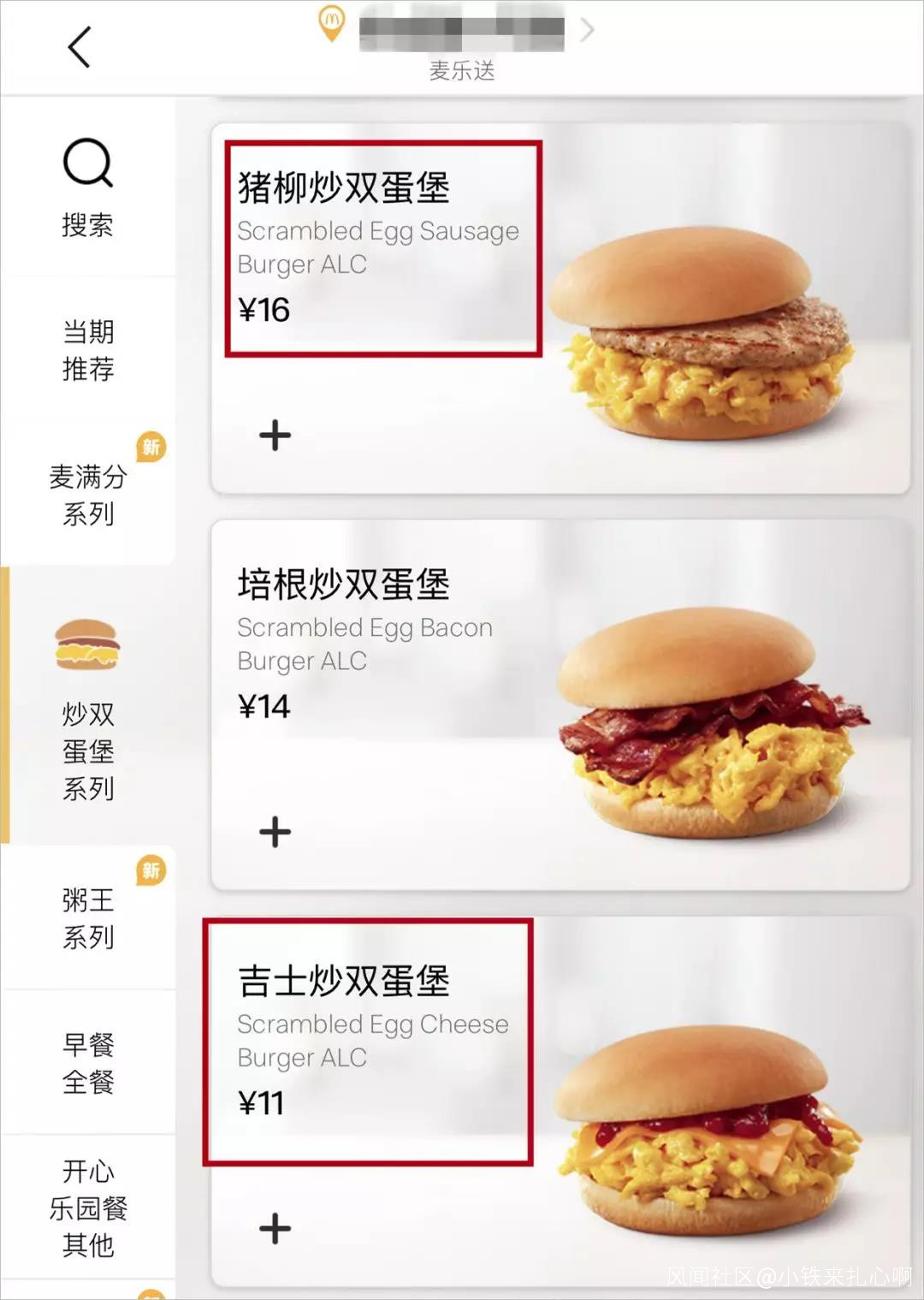 7月19日早上,記者先在麥當勞App上看到,麥樂送外賣平台上,“豬柳炒雙蛋堡”的價格為16元,“吉士炒雙蛋堡”為11元。