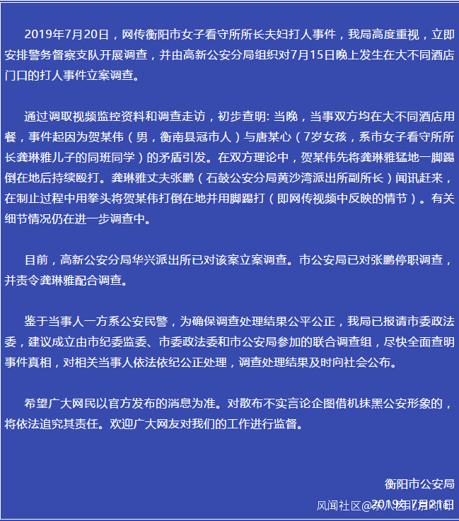 針對近日“網傳衡陽市女子看守所所長夫婦打人事件”,湖南省衡陽市公安局7月21日發佈通報稱,該事件發系7月15日晚上發生在大不同酒店門口。目前,衡陽市公安局高新公安分局華興派出所已對該案立案調查。市公安局已對張鵬停職調查,並責令龔琳雅配合調查。