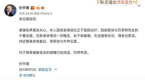 7月23日一早,孫宇晨稱因突發腎結石在醫院治療,取消與巴菲特午餐會面。(號稱突發腎結石,孫宇晨取消巴菲特午餐會面,3000萬打水漂了?)