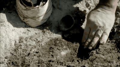 他們首先在土坑裏墊上一個動物頭骨,用來接瀝青。他們還在頭骨裏放一顆小石子,讓瀝青冷凝。