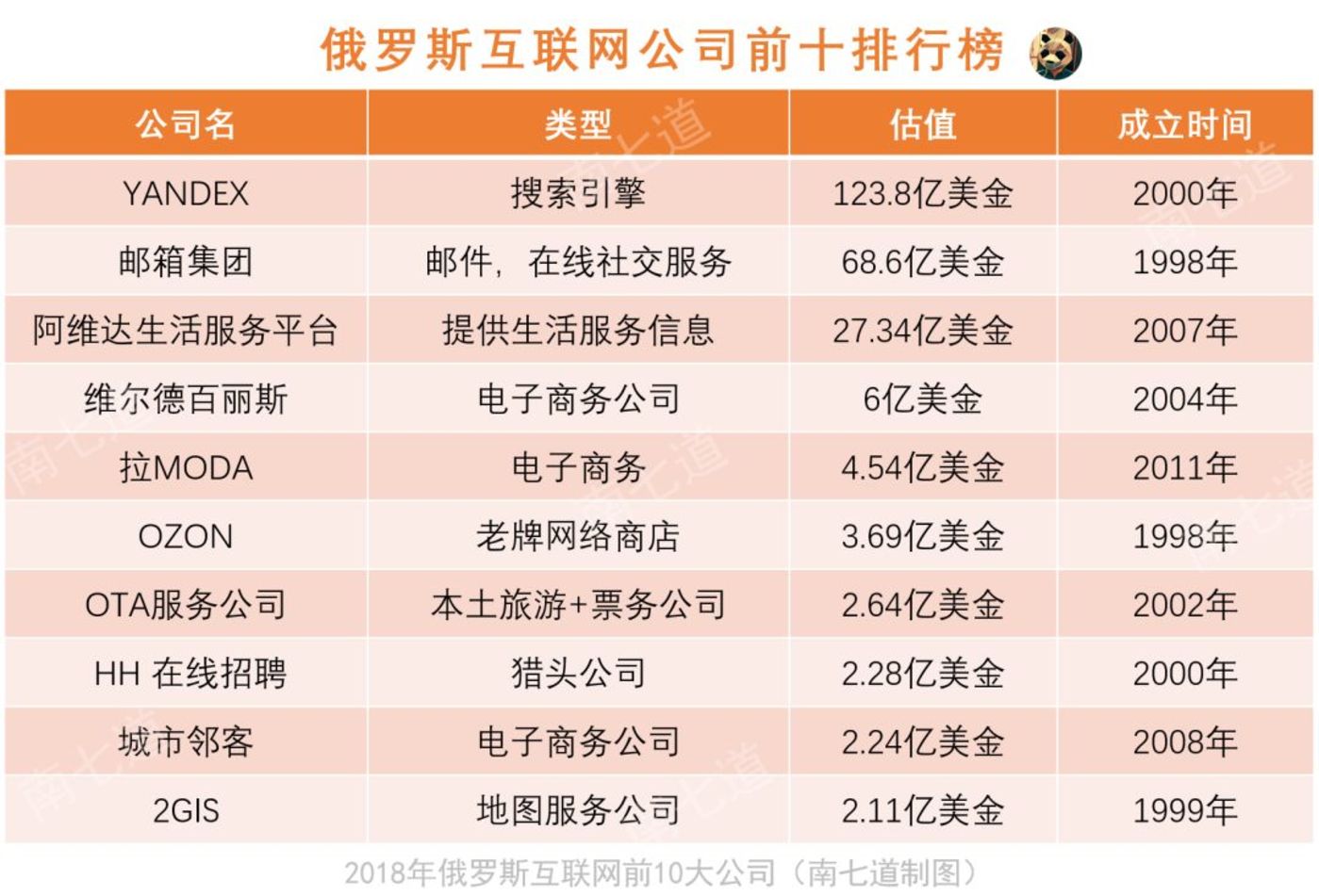 目前俄羅斯10大互聯網中,目前市值最高的兩家,Yandex和Mail.ru(旗下包括Vkontakte)。分別在2010年,2011年上市,此後俄羅斯再也沒有出現更大的互聯網公司。2018年6月的一份榜單顯示,全球市值排名前100的科技公司中,美國公司是最大贏家,其次是中國,俄羅斯無一上榜。