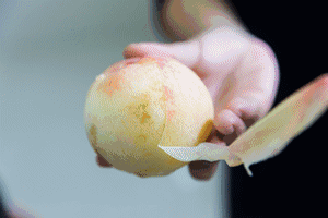 然後把這顆水蜜桃放在兩手之間抱住,兩手大拇指輕輕用力,就自然地把皮往兩邊扯開了。
