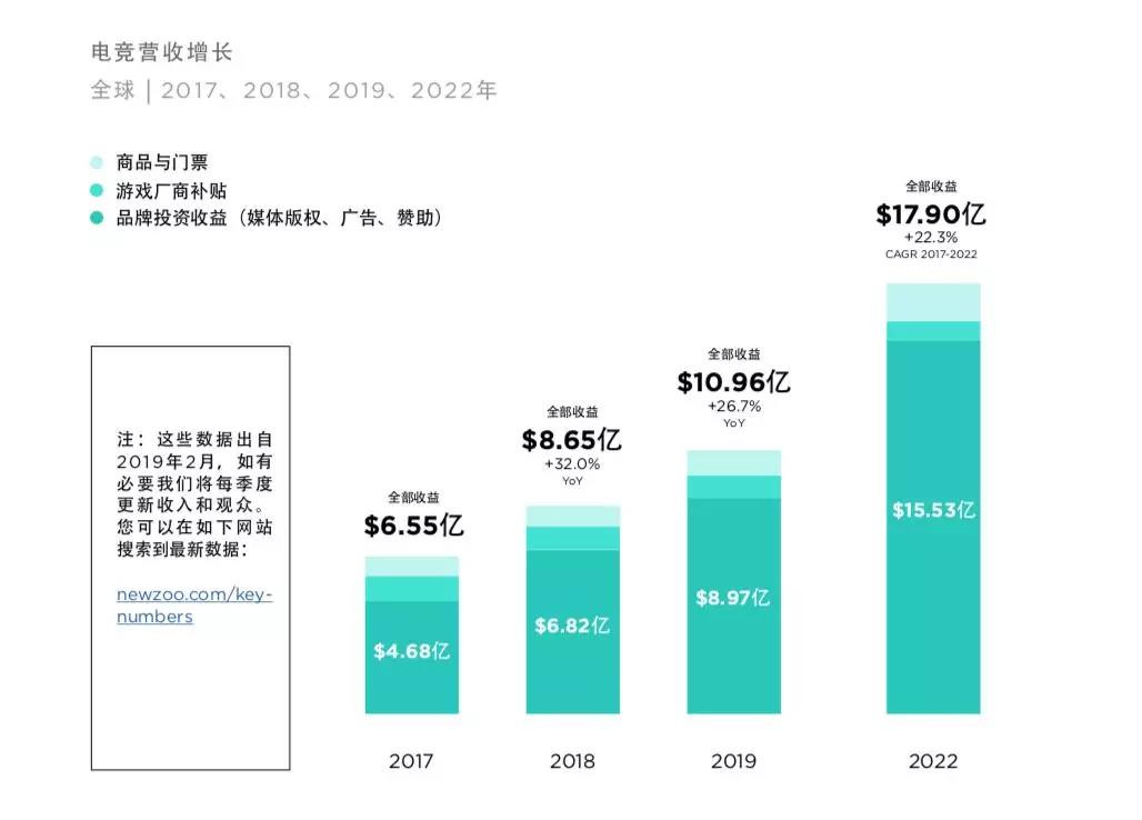同時從營收能力來看,電競市場依然有相當大的潛力,並在近幾年實現了大幅度的增長。根據Newzoo分析與預測,電競行業每年平均收入增長超過30%。2019年電競電競營收將首次攻破10億美元大關,成為全球電子競技市場的里程碑,並將在2022年達到17.9億美元。