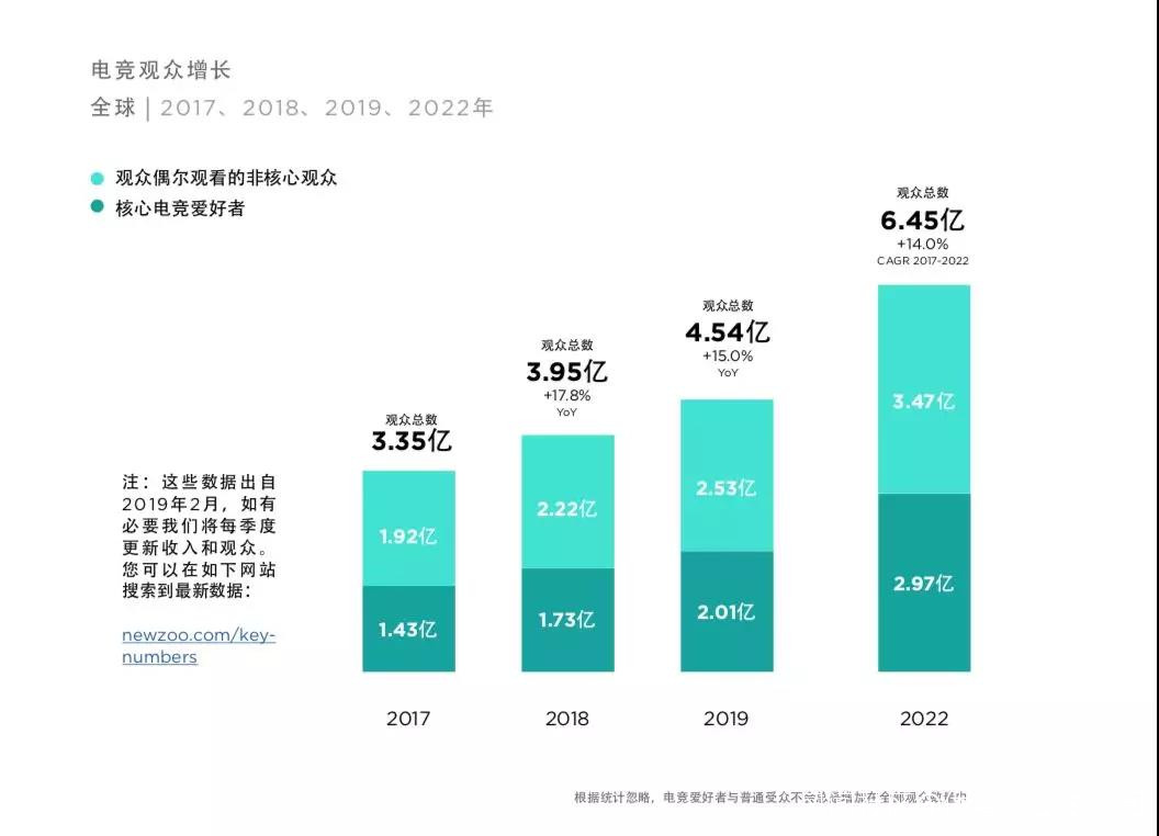 其實,不光網球,整個電競領域的發展還是很值得期待的。根據Newzoo發佈的數據,自2016年以來,電子競技觀眾大幅增加,這其中包括核心電競愛好者和偶爾觀看的非核心愛好者。2019年全球範圍內的電子競技觀眾將增長到4.5億人次。其中,核心電競愛好者將佔2億人次,同比增長2820萬,並將在2022年以15.7%的複合年增長率(2017-2022)增長至3億人次。與此同時,2019年全球偶爾觀看的非核心觀眾人數將達到2.5億,高於2018年的2.2億,並將在2022年 以12.6%的複合年增長率增長至3.5億人次。