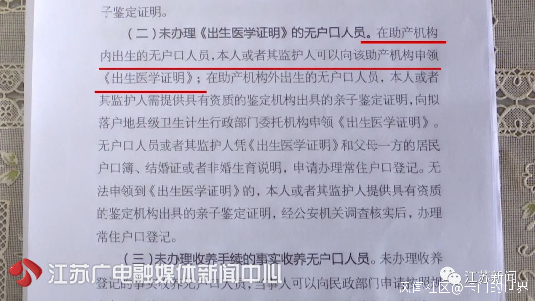 7月18日,南京市江北新區公安分局方面表示,根據2015年12月31日《國務院辦公廳關於解決無户口人員登記户口問題的意見》和2016年3月17日江蘇《省政府辦公廳關於解決無户口人員登記户口問題的實施意見》,在助產機構內出生的無户口人員,其監護人可以向該助產機構申領《出生醫學證明》,泗陽縣婦幼保健院出具的文件比較舊,應當以這兩個文件為準。