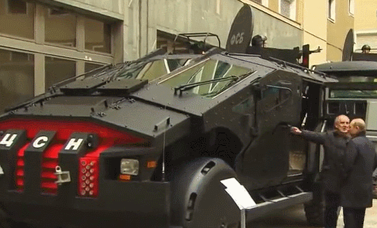 不過在反恐作戰中,由於恐怖分子的武器以普通步槍為主,所以很多反恐作戰車輛反倒保留了射孔的設計,比如在俄羅斯內務部特種部隊的多次反恐行動,就出現了一款外形拉風的裝甲車,不僅車頂有機槍,車的兩側還開有多個射擊孔。