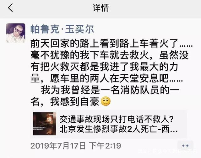 事後,帕魯克在網上看到了車禍現場視頻,也看到了自己救火的身影。他轉發朋友圈寫道:“前天回家的路上看到有車着火了,毫不猶豫的我下車就去救火,雖然沒有把火救滅,但是我盡了我最大的力量,願車裏的兩人在天堂安息吧……我為我曾經是一名消防隊員而感到自豪。”