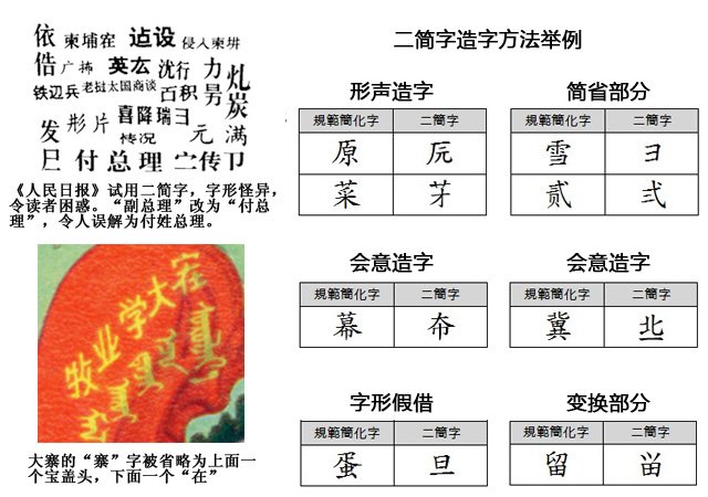 “二簡”與“一簡”一樣,都是針對最常用的字,比“一簡”還要簡單。幾乎動用了所有的方法,想方設法減少筆畫、簡化結構。大致上可以從簡化形體和同音兼併兩個方面去分析,這兩者不是截然分清的,有部分是交叉內容。雖然“二簡”只對常用字簡化,但漢字的體制並不允許隨便地對局部進行改造,其原有的成分與新簡化字相互牴觸。所以,“二簡”突破了“以利目前使用”、針對常用字的原則,力圖全面的改進漢字的總體功能。因此,淘汰了一部分“容易讀錯和寫錯的字”,改為同音字;將一些複雜的偏旁和結構簡化或變換為新的寫法;合併了一部分偏旁。這種簡化實際上是對漢字進行了大的手術。具體可參加下圖: