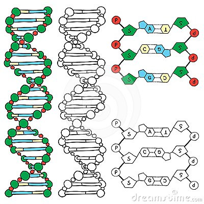 1 (右下)構成骨架的脱氧核糖(大的五邊形S)通過磷酸(p)連接成鏈,每一個脱氧核糖連接着四種鹼基(ATGC)之一,對應的鹼基按鹼基互補的規律結合。一分子磷酸+一分子脱氧核糖+一分子鹼基三種物質組合在一起,形成了DNA鏈的基本組成單位,被稱作核苷酸(圖中共有六個核苷酸分子)。核苷酸首尾相連,兩兩對接,形成長長的鏈條,就是我們常説的DNA。