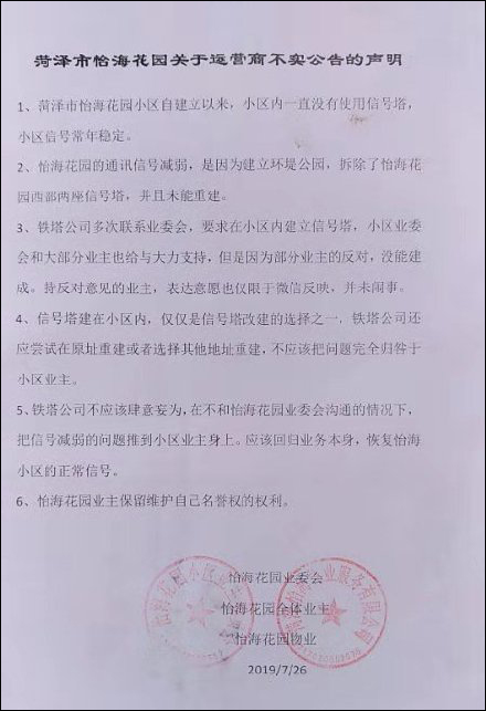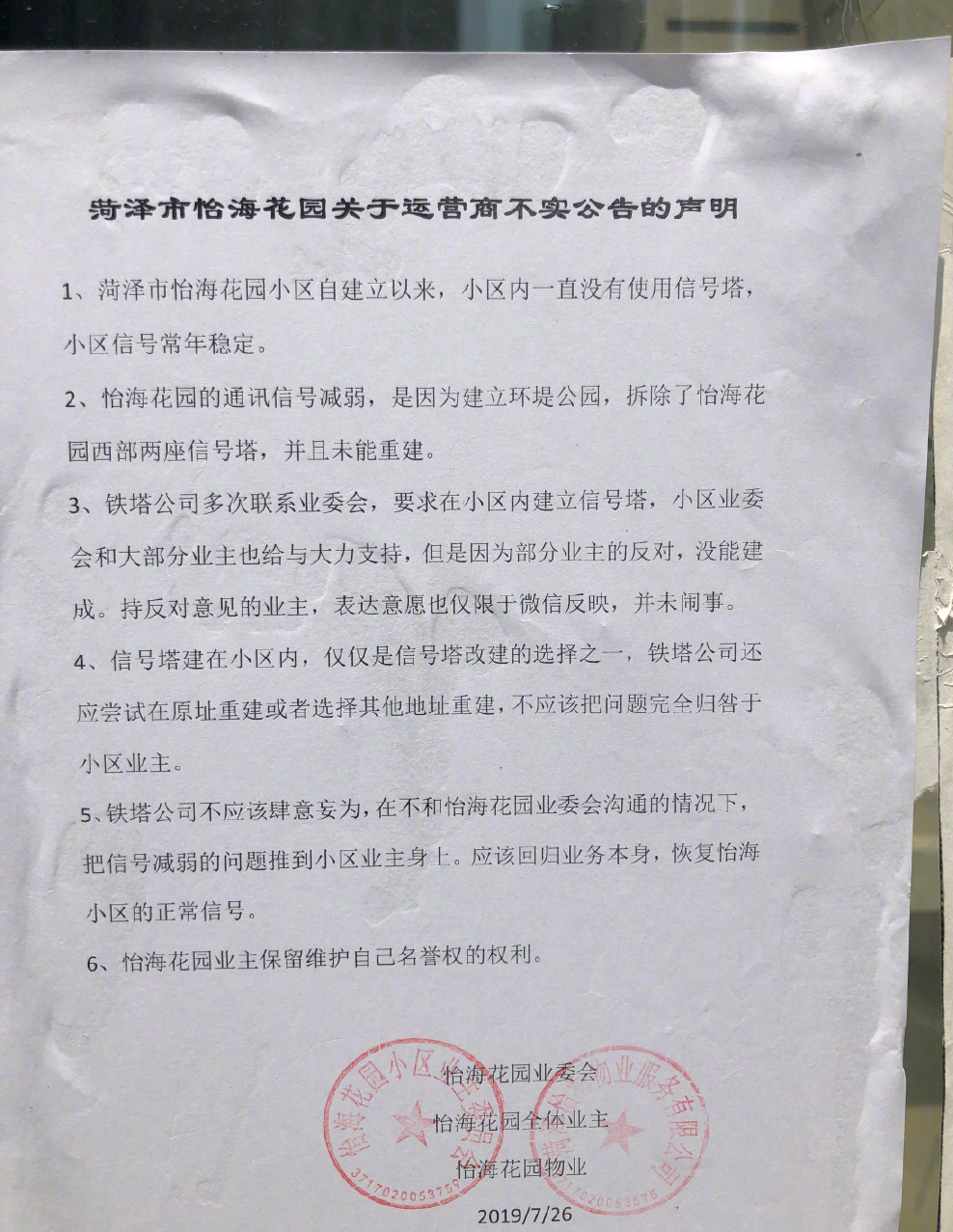 7月26日,菏澤市怡海花園業委會、怡海花園全體業主、怡海花園物業發佈聲明稱,三大運營商及鐵塔公司所發公告不實。怡海花園做出了以下6點聲明: