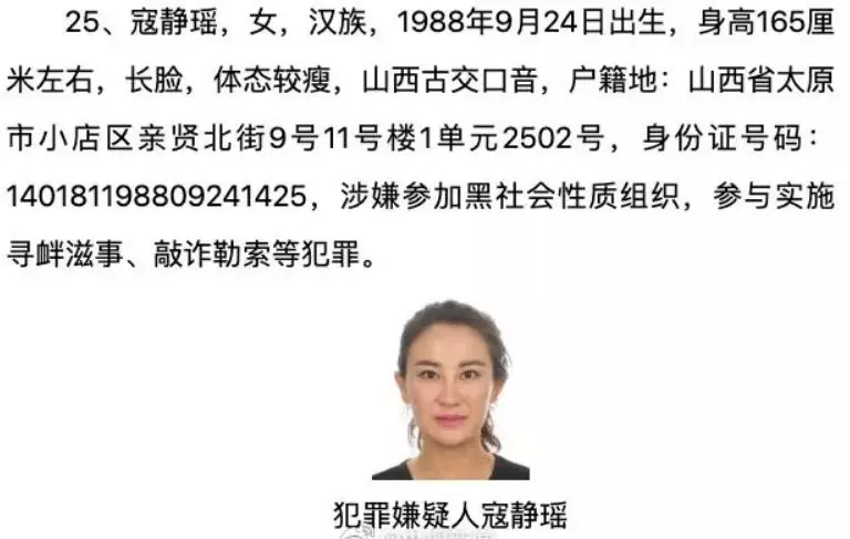 其中山西籍通緝犯寇靜瑤涉嫌參加黑社會性質組織,參與實施尋釁滋事、敲詐勒索等犯罪被依法通緝。