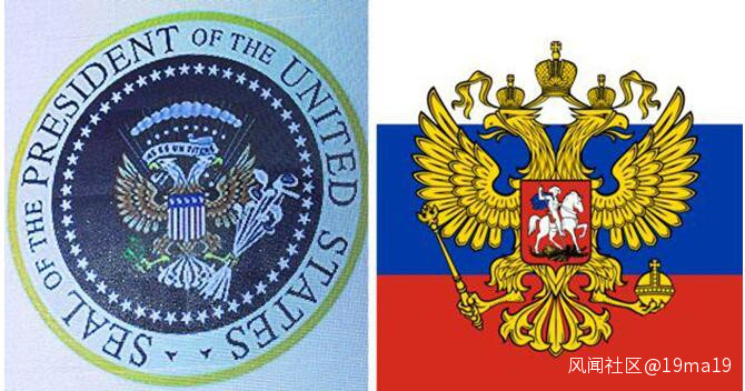 被惡搞的美國總統徽章(左)與俄羅斯國徽(右)