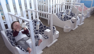 然後把嗷嗷待哺的寶寶抱過來,把奶瓶固定上去。