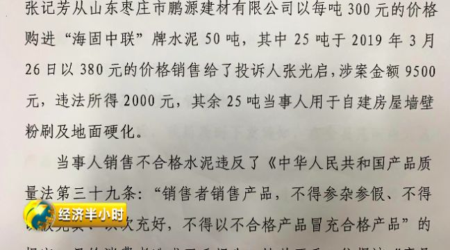 檢測報告張光啓立即通過經銷商張記芳找到水泥廠家——山東棗莊鵬源建材公司。然而,一聽水泥有質量問題,廠家便開始辯解,這些問題水泥並非是他們生產的。但最終,山東棗莊鵬源建材公司代表高安生在查看工廠錄像後,承認這批水泥出自他們的工廠。