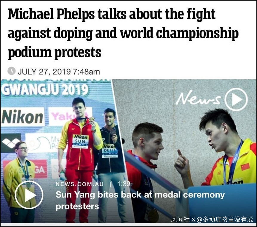 光州游泳世錦賽舉行得如火如荼,泳壇傳奇邁克爾-菲爾普斯也在美國家中關注着比賽進程。相比起比賽,本屆賽事最大的新聞無疑是“孫楊事件”。對此事件,菲爾普斯表示,個人並不認同運動員抗議的行為,國際泳聯是時候做事了,所有運動員都厭倦與涉藥選手一起比賽。