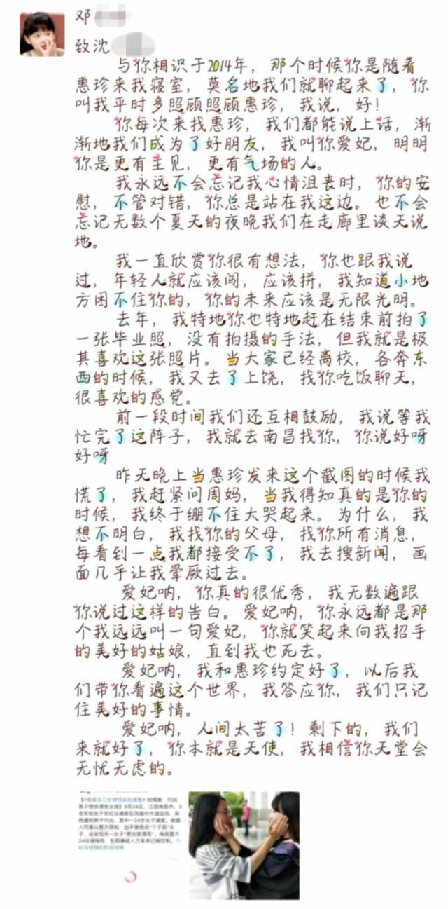 等5點多天亮了我們到了南昌,9點多去的法醫基地,看到女兒的樣子,一隻眼睛瞪着,嘴巴張得大大的,脖子肩膀全是傷口,滿身都是血,那種慘狀對我們太殘酷了。
