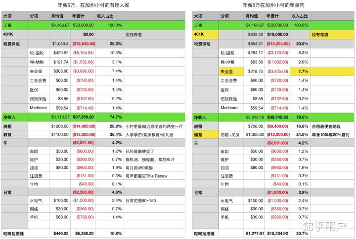 左邊是我家的實際支出。右邊是假設單身狗情況。 右邊黃色部分為需要重點關注的變化。單身有餘錢可以存401k,這部分免税,所以收的税比家庭還少。