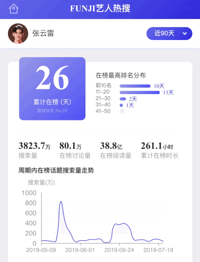 注:gif圖為張雲雷近90天內話題搜索量趨勢圖,其中最高峯值話題為5.13日“張雲雷調侃汶川地震”。