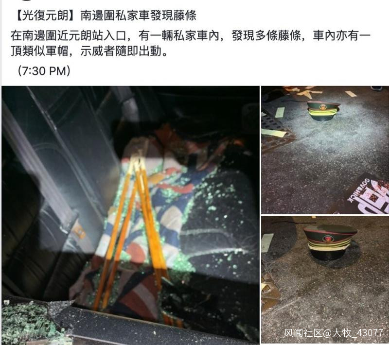 在這場未經過香港警方批准許可的示威活動中,一羣極端示威者在元朗南邊近元朗站入口處砸壞了一輛私家車,還聲稱在私家車內發現多條藤條,以及一頂疑似軍帽,聽聞這個消息後許多“示威者”隨即出動。