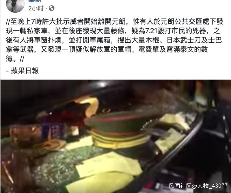 在這場未經過香港警方批准許可的示威活動中,一羣極端示威者在元朗南邊近元朗站入口處砸壞了一輛私家車,還聲稱在私家車內發現多條藤條,以及一頂疑似軍帽,聽聞這個消息後許多“示威者”隨即出動。