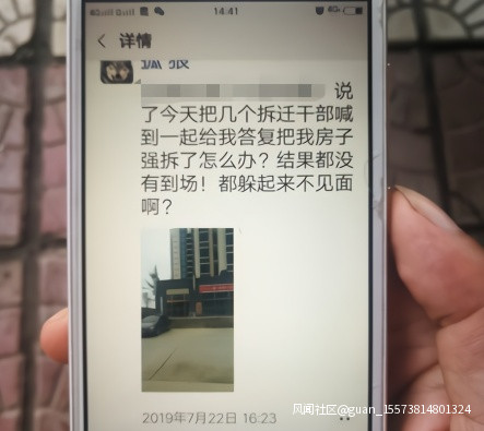 2019 年7 月22 日," 説了今天把幾個拆遷幹部喊到一起給我答覆把我房子強拆了怎麼辦?結果都沒有到場,都躲起來不見面啊?" 配圖是拆遷指揮部的外部。