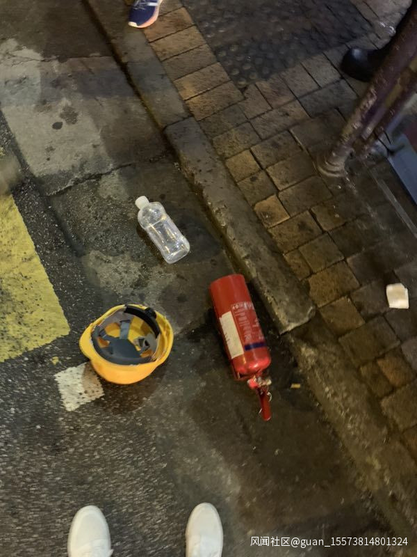 28日晚上20:35,警察驅散示威者後,環球時報記者正坐在德輔道西路邊休息,突然有兩名暴徒從兩米外的巷子裏衝出偷襲,向警察投擲玻璃瓶後迅速逃竄。