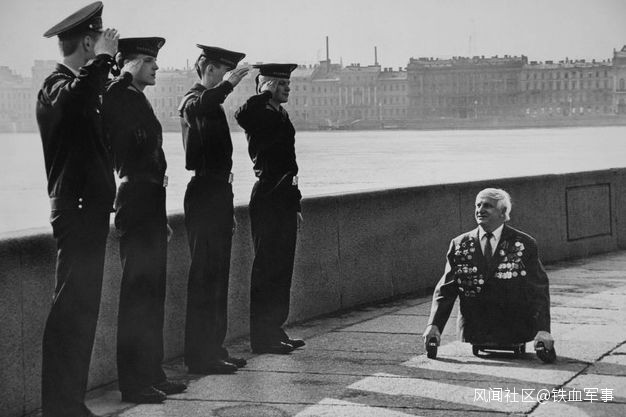 後來,有一次活動集會上,他與曾經的海軍少將伊薩科夫海走在一起,他也是殘疾軍人,使用枴杖,站在碼頭上的水手們沒有接到命令就站了起來,向他們敬禮。在那一刻,我拍下這張照片。