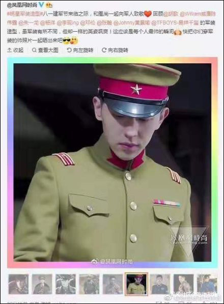 7月31日上午,@鳳凰網時尚 在八一建軍節來臨之際發了這麼一條微博。微博中,@鳳凰網時尚 為了表達向軍人致敬,貼出了9位男演員的軍裝照片。