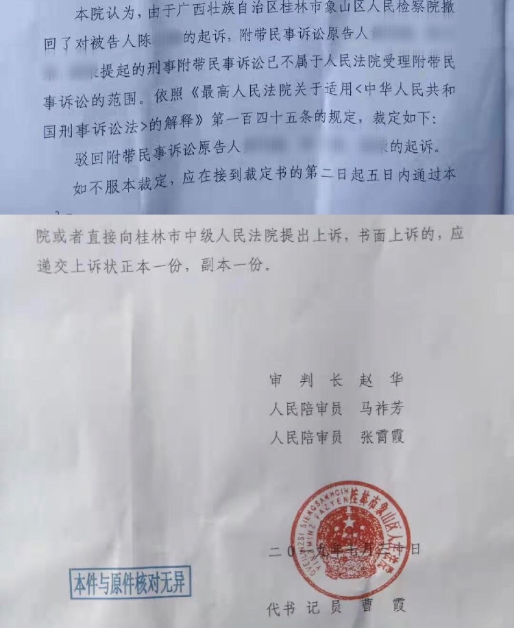 象山法院7月30日作出刑事附帶民事裁定書,駁回附帶民事訴訟原告人的起訴。 受訪者供圖