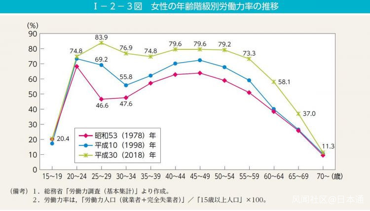 女性30歲前後開始由於結婚、生育辭掉工作導致就業率下降的“M字曲線”一直是一個社會課題,目前日本在努力解決這個課題。政府不斷完善的育兒休假制度有助於解決這個課題。只是女性工作的形式多數是短時間打工等非正式工作,這種形式佔女性全體的55%。男性從事非正式工作的佔23%,與女性相比相差2倍多。