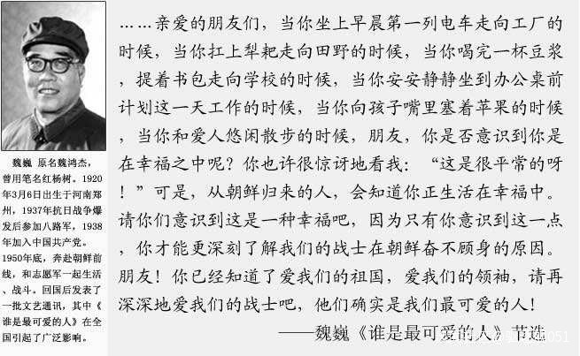其實,《誰是最可愛的人》就不用説了,魏巍的《依依惜別的時刻》、《地球的紅飄帶》、《東方》都是我百讀不厭的作品。