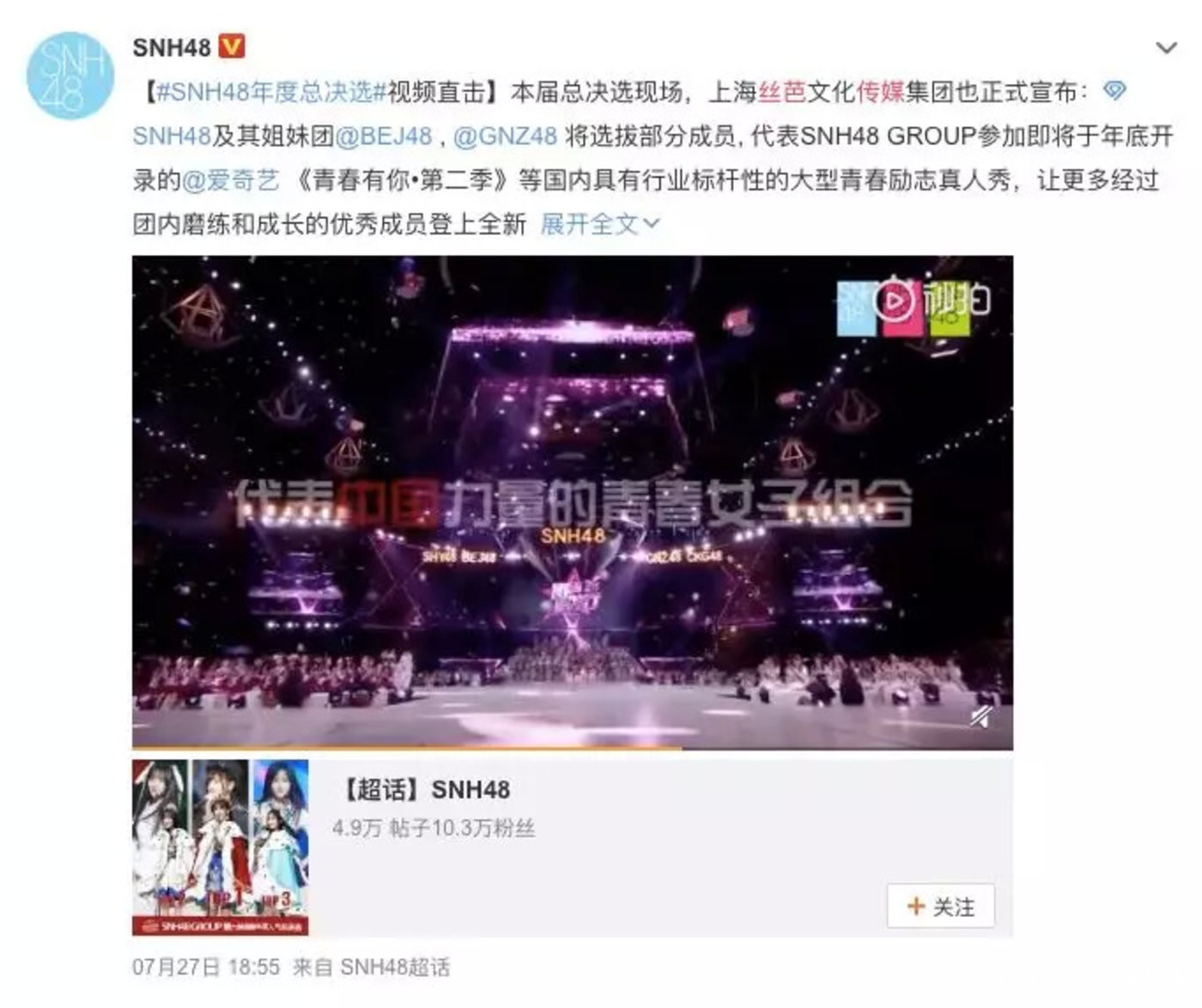 在今年總決選落幕後,絲芭傳媒官宣SNH48確定參加《青春有你》第二季,這是公司面對第三大危機的一種應對手段。