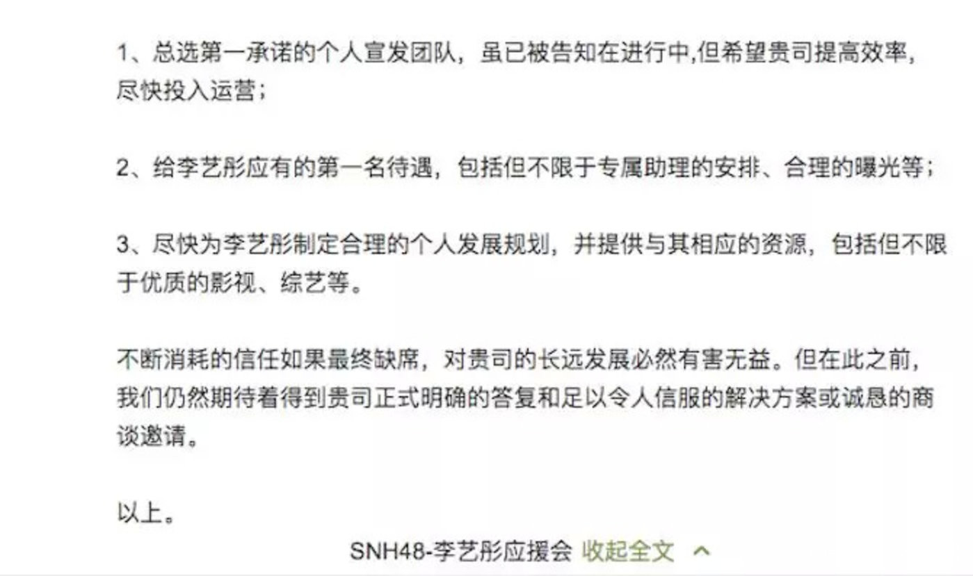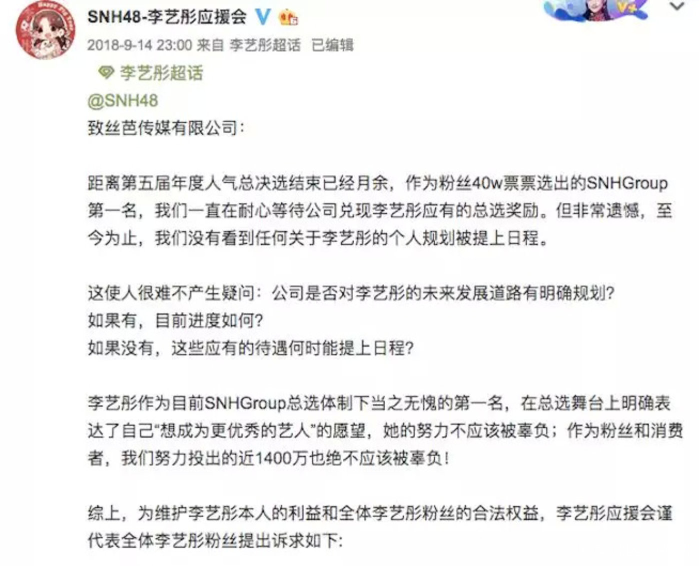 有意思的是,在2018年8月鞠婧禕粉絲的這次喊話後,同年9月,獲得了2018年總決選冠軍的李藝彤粉絲也通過微博對公司提出疑義,要求提高藝人個人宣發團隊的建設與運營效率,安排合理的曝光,以及提供相應的優質資源。