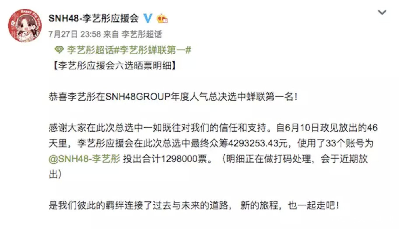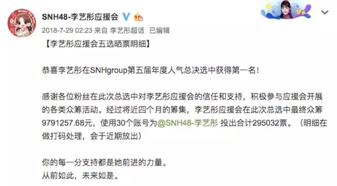 從李藝彤粉絲應援會統計的數據來看也是如此——2018年李藝彤應援會在總選中眾籌979.1萬元進行投票,而2019年僅籌429.3萬元投票。頭部藝人的粉絲付費熱情下滑如此嚴重,那麼非頭部的也就可想而知。