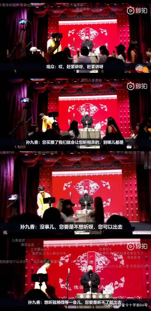 舞台前方的秦霄賢沒有講話,也沒有停下手中收禮的動作,而站在台上的孫九香對着話筒回覆該觀眾:“您買票了我們會讓您聽相聲的,到哪兒都是。”之後孫九香面無表情地“懟”觀眾説:“沒事兒,您要是不想聽啊,您可以出去。”