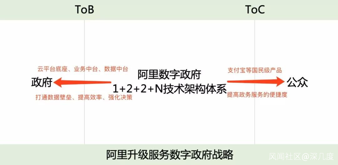 為了適應這種ToB+ToC的整合,阿里再次公佈了數字政府1+2+2+N的技術架構。