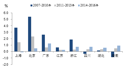 根據經濟學者李迅雷的研究,上海和北京的人口增速在2011年以後均明顯下降,最近兩年甚至出現負增長。2007-2015年,江蘇省人口淨流入量亦逐年減少,2016年常住人口僅增加22萬人。