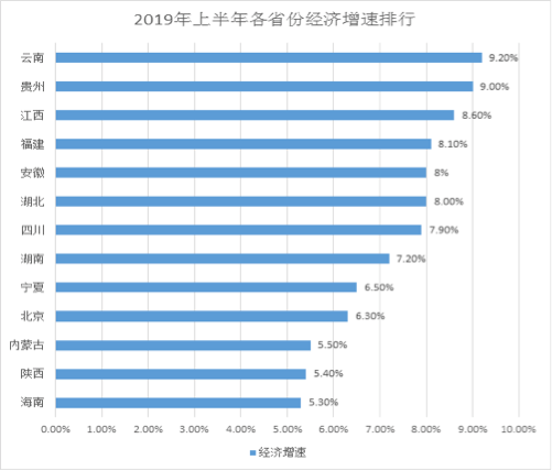 其中,雲南與貴州的增速最為出色,增速分別為9.2%和9.0%,成為上半年的冠軍和亞軍。而且,經濟增速高於北京這個一線城市的有10個省份,絕大部分是經濟發展中省份和經濟欠發達省份。