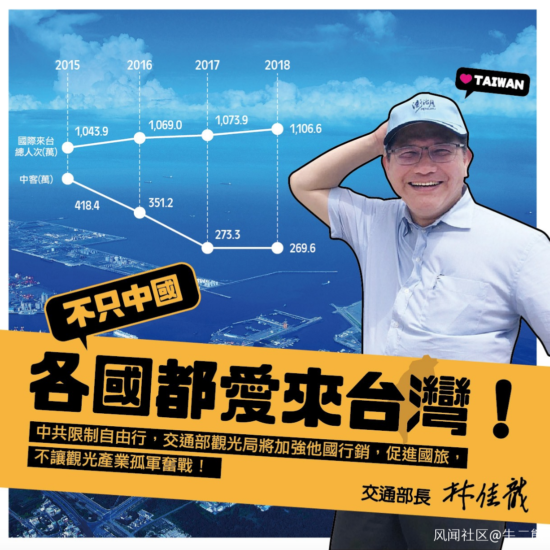 於是我們看到台灣交通部門負責人林佳龍就在臉書上製造了宣傳圖片,告訴台灣人,雖然陸客人數逐年減少,但台灣的總體觀光人數確實逐年遞增,2015年是1043萬人,2016年漲到1069萬人,2017年是1073萬,2018年則突破1100萬,達到1106萬。當然,我們都知道這種數字突破的背後是什麼意思,當然就來自於瘋狂的注水,大幅度且單方面開放東南亞國家免籤,帶來了極高的脱團率,很多人是假觀光、真賣淫或者真打工,但這些蔡當局雖然不會提,媒體還是會幫他揭露。更重要的是,觀光業者看的也不是人數的多寡,而是遊客消費額的增減,根據台灣官方的統計數字,不出所料的當然是逐年遞減,最近一次公佈的數字是2017年,觀光收入是123億美元,而前一年的2016年則是133億美元,再前一年也就是2015年更是多達143億美元。