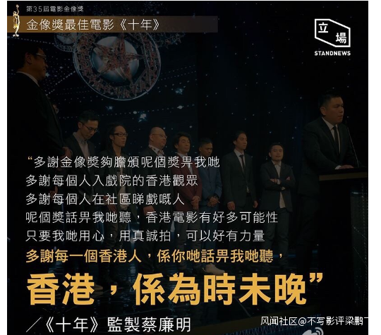 2016年香港電影《十年》獲得當年金像獎最佳電影。這部電影由香港5名年輕導演參與拍攝,也可以説代表了部分香港年輕人對於當前香港社會的某些實際想法。