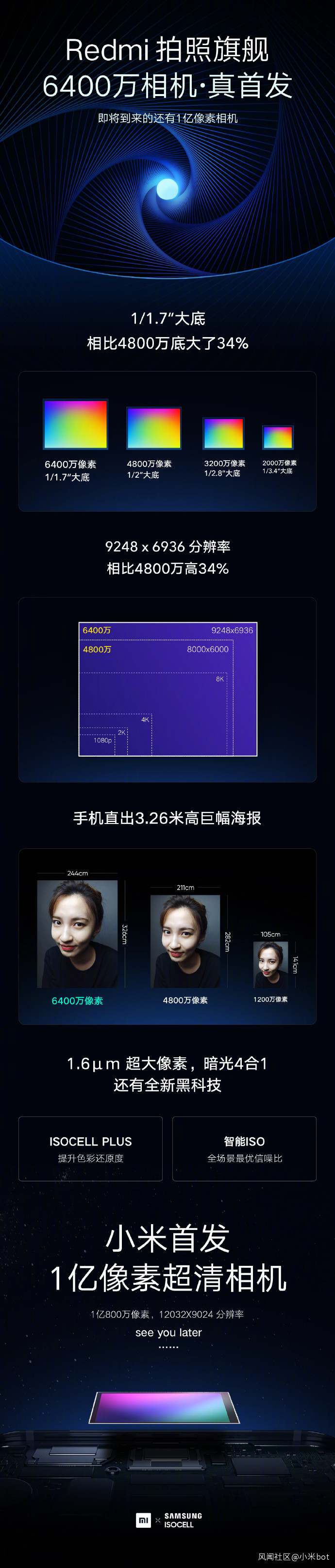 本次溝通會僅僅持續了半個多小時,主要發佈的內容也與之前的猜測一樣,為紅米與三星“聯合首發”的6400萬超清相機,除此以外,就是coming soon(等多久咱們另説)的,由小米首發的一億八千萬像素超清相機。