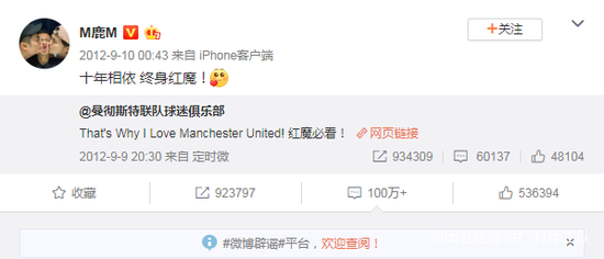 2012年9月,鹿晗轉發了曼聯官微的一條微博,亮明自己的身份:“十年相依,終生紅魔!”這條言簡意賅的微博刷出上億評論,創下吉尼斯世界紀錄。今年,鹿晗造訪曼聯的卡靈頓訓練基地,和博格巴、德赫亞等一線球星合影。為了感謝鹿晗對紅魔十七年如一日的支持,曼聯官宣,小鹿正式出任“曼聯紅魔使者”,曼聯第一明星粉就此蓋章。