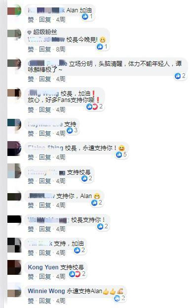網民Cashm説:“其實好多呢啲(攻擊者)都唔系您的 fans,佢哋最叻系編劇,乜都編得出! 我好感動你琴日(昨日)出嚟, 可惜緣慳一面, 永遠支持譚校長!(其實這些攻擊者都不是您的粉絲,最厲害的編劇都編不出!我好感動你昨日出現,可惜無緣見一面,永遠支持譚校長)”