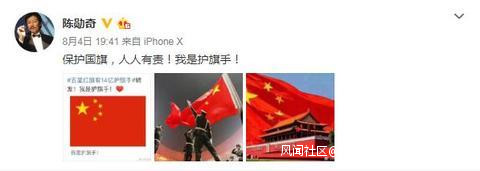 4日,新浪微博話題#五星紅旗擁有14億護旗手#登頂熱搜榜,護旗手紛紛前來報到!成龍、陳小春、劉愷威、陳曉東、陳勳奇、向佐等香港藝人發聲力挺。