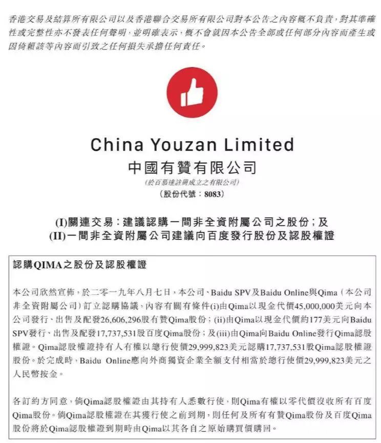 過去行業總公認有贊僅僅是在微信生態內成長起來的企業。然而另人意外的是,8月8日,有贊(08083.HK)發佈公告稱,獲得百度的投資。