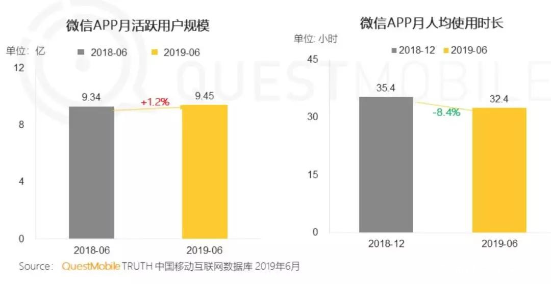微信在過去一年來月活增長僅為1.2%,微信的人均使用時長甚至還下降了8.4%。