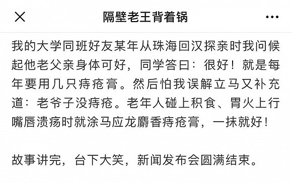 採訪結束,我發現在場的一位馬應龍員工非常眼熟,反應了一會兒才發現我在馬應龍的微信公眾號上看到過他。