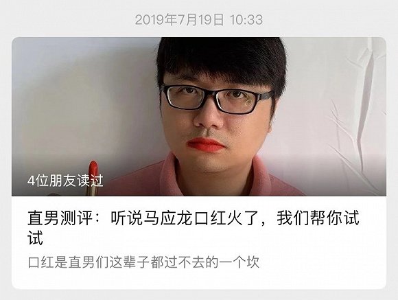 周亮自稱是擁有數萬女粉的婦女之友,他也登上了這篇推文的封面,嘴上塗的是男性博主飛仔Joey也推薦的馬應龍八寶絳紅色口紅。