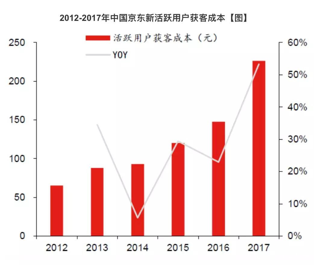 觀研天下數據中心在2017年曾經發布過一份京東新活躍用户獲客成本的數據,數據顯示,京東在2017年獲客成本在220元左右,即使在2016年也高達150元。